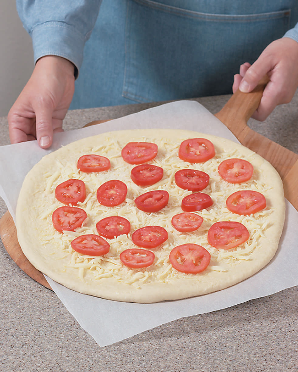 Then transfer the pizza parchment paper and all onto your preheated pizza stone I usually heat the oven to about 475 and bake until the crust is golden and the cheese is bubbly. A peel with a long handle will serve you best as this is the safest method to get the pizza into the oven. Use a pizza peel to transfer the pizza from being rolled out to the pizza stone.
